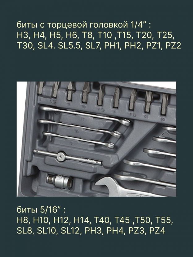 - биты 5/16": T40, T45, T50, T55, SL8, SL10, SL12, PH3, PH4, PZ3, PZ4, H8, H10, H12, H14;