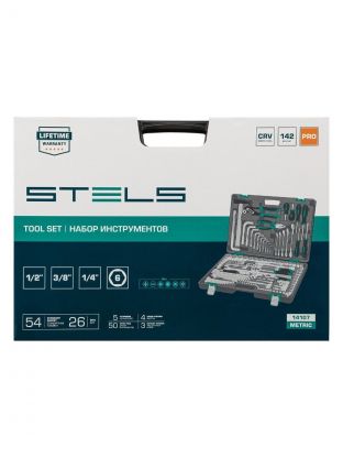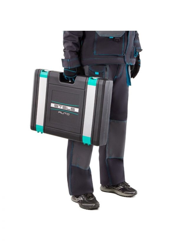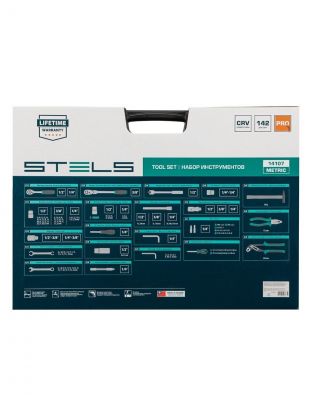 Набор инструментов Stels 14107 состоит из 142 предметов и является оптимальным выбором как для обычного автолюбителя, так и для специалиста автосервиса. Размещенный в кейсе из жесткого противоударного пластика комплект можно держать в гараже или возить с собой в автомобиле, производя с его помощью оперативное устранение неисправностей прямо в пути. В комплект вошла разнообразная оснастка - биты, биты-вставки, головки, а также обилие ручного инструмента - комбинированные ключи, ключи-шестигранники, отвертки, пассатижи и переставные клещи, трещотки и воротки, молоток.