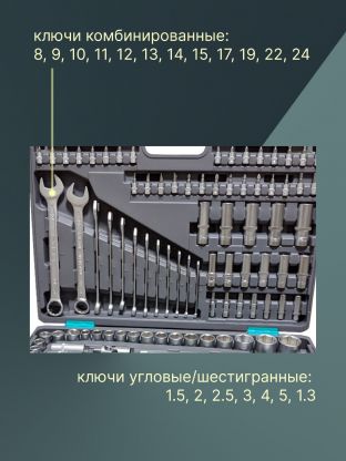 • Комбинированные ключи: 8 мм, 10 мм, 11 мм, 12 мм, 13 мм, 14 мм, 15 мм, 17 мм, 19 мм, 22 мм, 24 мм, 9 мм