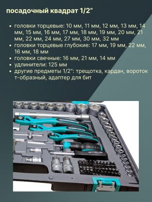 • Другие предметы 1/2": трещотка, кардан, вороток Т-образный, адаптер для бит