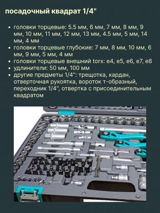 • Головки торцевые: 5.5 мм, 6 мм, 7 мм, 8 мм, 9 мм, 10 мм, 11 мм, 12 мм, 13 мм, 4.5 мм, 5 мм, 14 мм, 4 мм