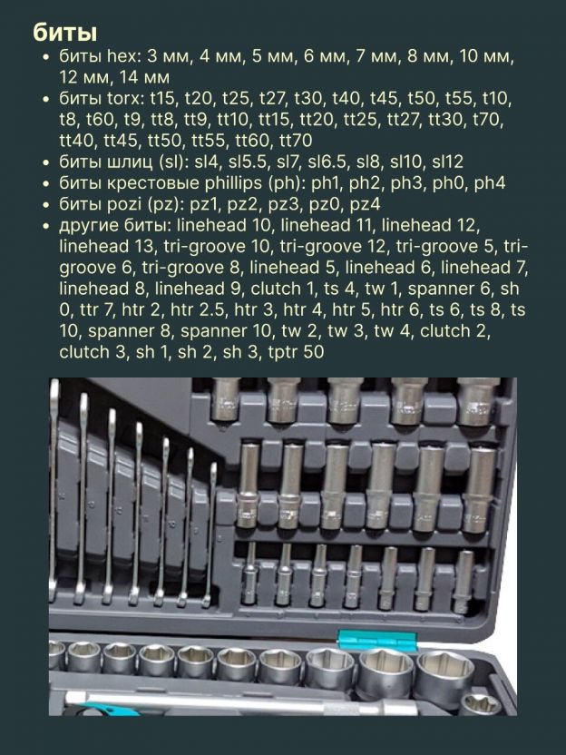 • Биты HEX: 3 мм, 4 мм, 5 мм, 6 мм, 7 мм, 8 мм, 10 мм, 12 мм, 14 мм