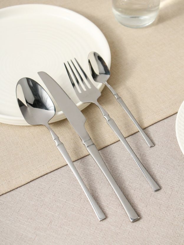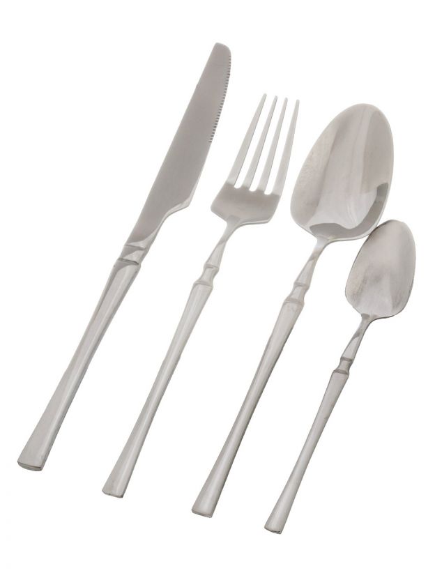 Комплект рассчитан на 6 персон: по 6 вилок, ложек, ножей и чайных ложек — удобно для семьи или небольшой компании.