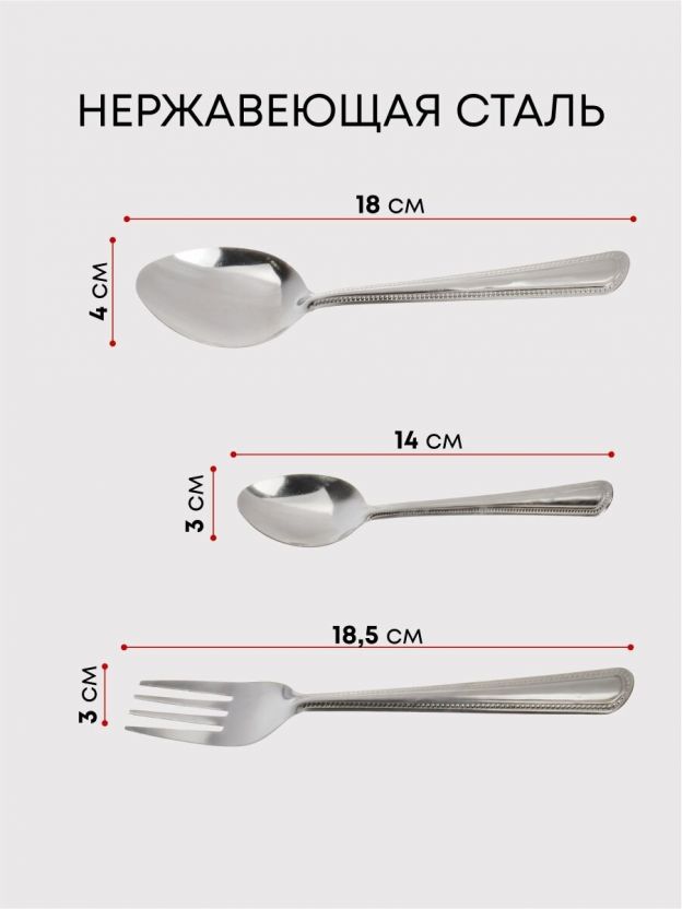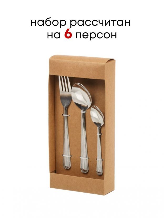 В комплекте 18 предметов: рассчитан на 6 персон, каждый предмет длиной 18 см, подходит для столового и чайного назначения.