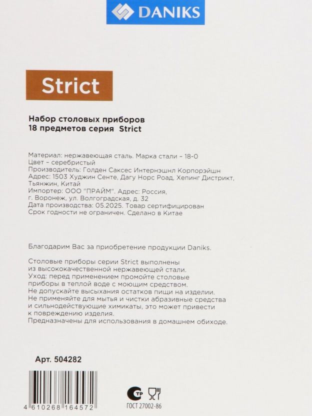 Часто спрашивают, подходит ли такой набор для подарка или ежедневного использования. Ответ — да: оптимальный состав (ложки, вилки, ножи) рассчитан на 6 человек, что удобно для семейных обедов, встреч с друзьями и выездов на дачу. Как выбрать столовые приборы, чтобы они служили долго? Обращайте внимание на материал и качество обработки — Daniks Strict выполнен из цельной нержавеющей стали, что гарантирует отсутствие сколов и трещин даже при частом использовании.