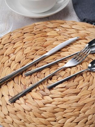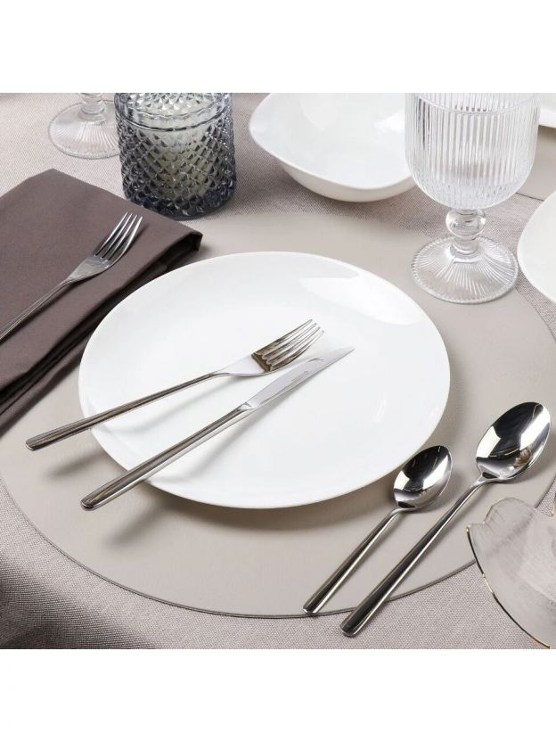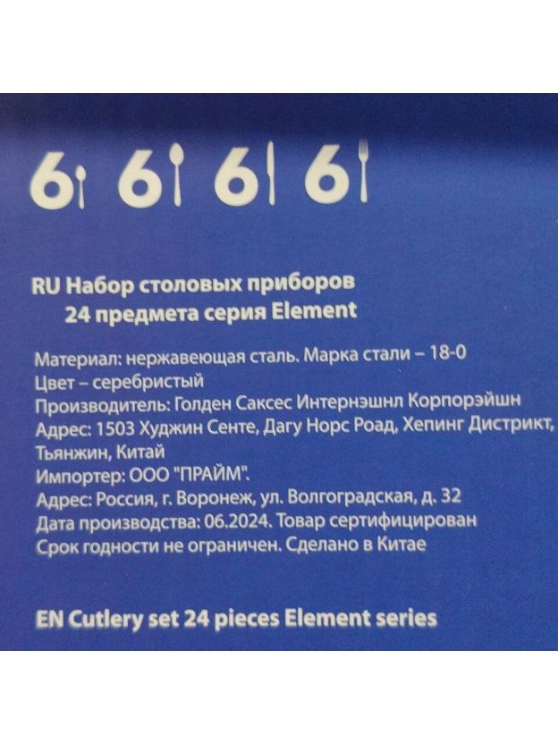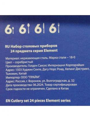 Все 24 предмета изготовлены из нержавеющей стали без покрытия, длина каждого — 23,5 см. В комплекте: столовые и чайные приборы на 4 персоны.