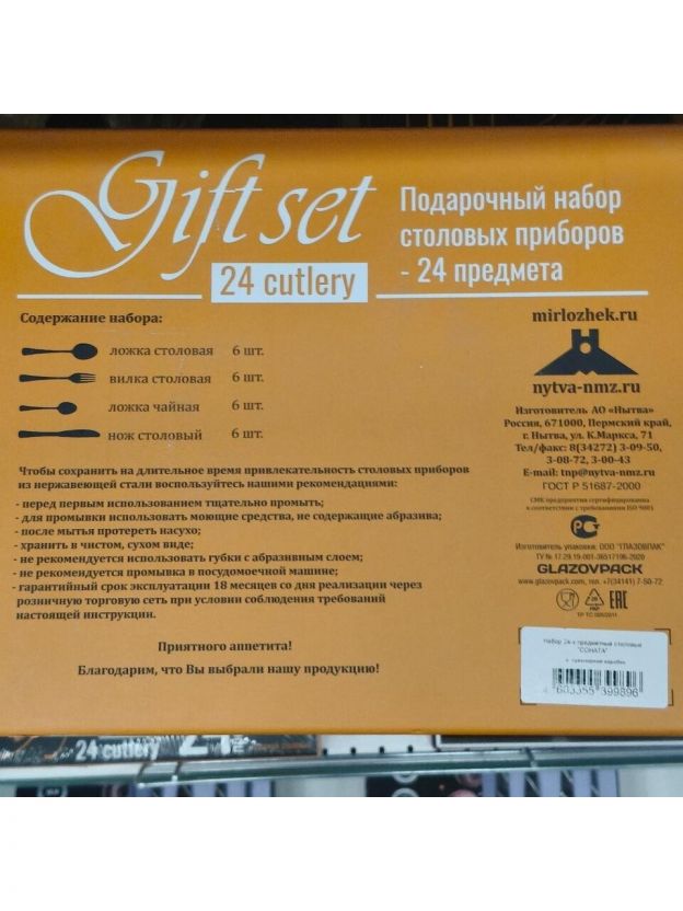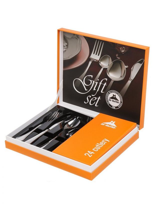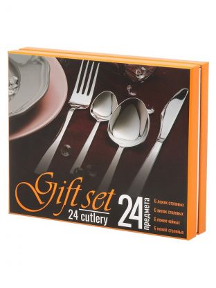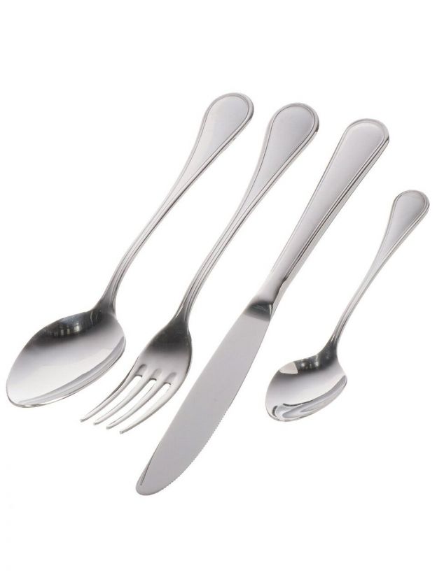 В комплекте 24 прибора из нержавеющей стали без покрытия: ложки, вилки, ножи, чайные ложки на 6 персон.