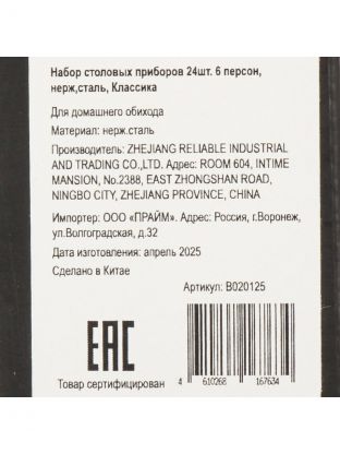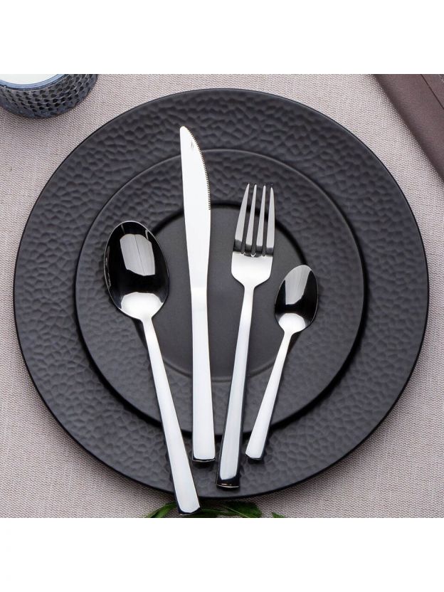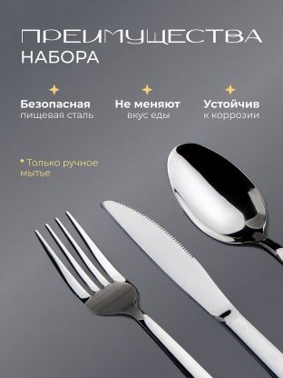 В комплекте 24 предмета из нержавеющей стали: рассчитано на 6 персон для сервировки основных и чайных блюд. Сталь 410.