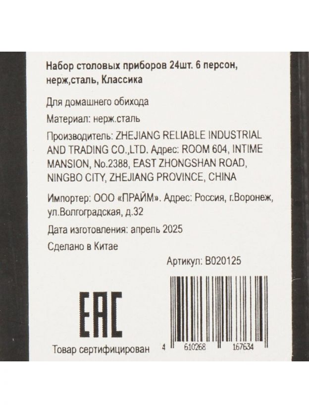 Набор столовых приборов нержавеющая сталь, 24 предмета, Классика, B020125, 6 персон