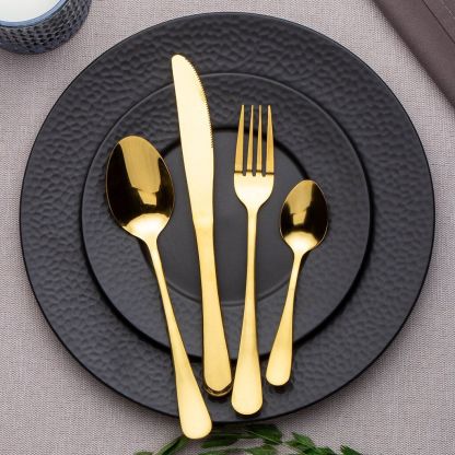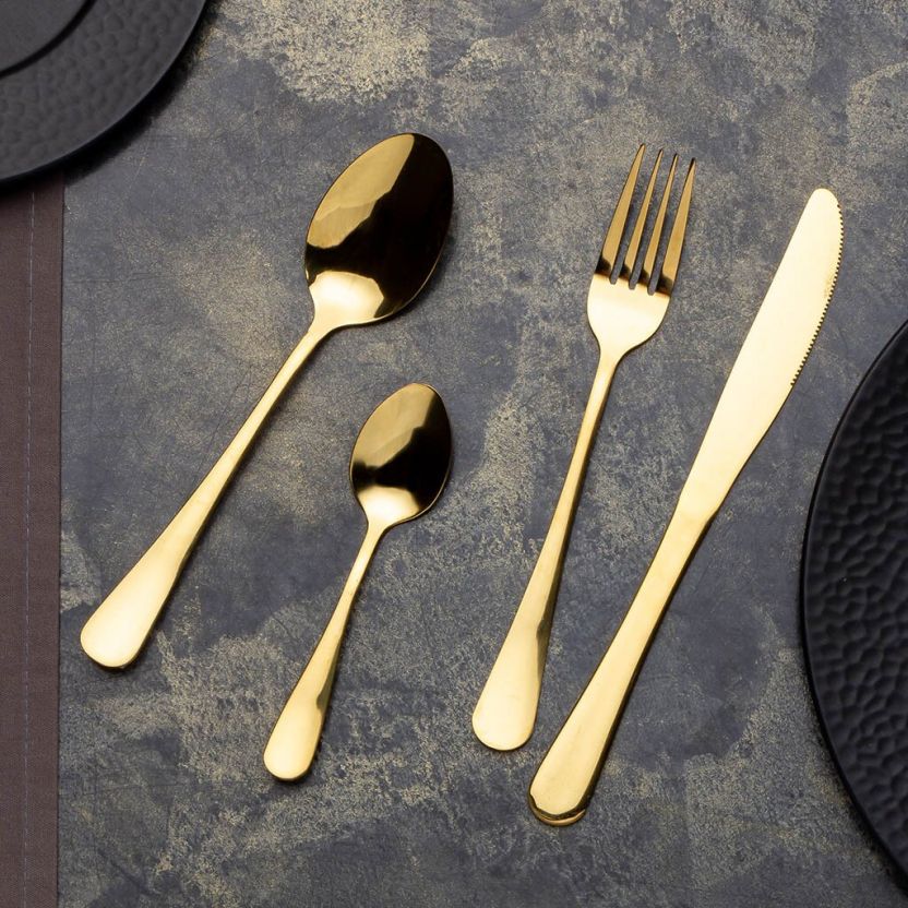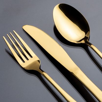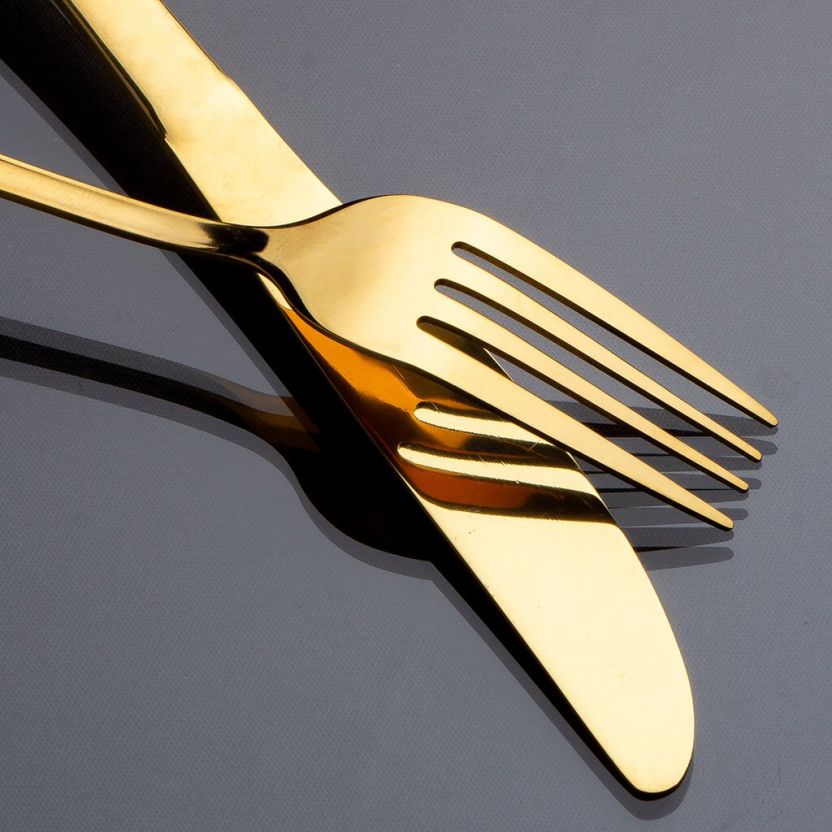Ищете, какой набор столовых приборов выбрать для 6 персон? Этот комплект сочетает классический стиль с современным золотым глянцем — он станет центром внимания на любом застолье. Нержавеющая сталь обеспечивает прочность и устойчивость к коррозии, а гладкая металлическая ручка удобно лежит в руке. Такой набор столовых приборов часто выбирают для сервировки праздничного стола или в качестве презента на новоселье, свадьбу, юбилей.