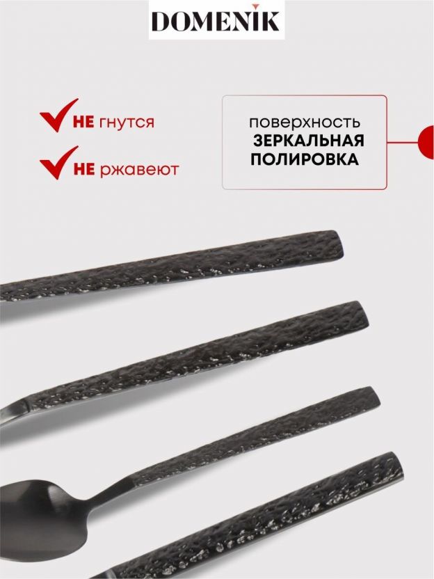 Если вы ищете, какой набор столовых приборов выбрать для подарка или сервировки на праздник, обратите внимание на этот комплект: он не требует особого ухода, не боится частого использования, а тонкие металлические ручки удобны для ежедневного применения. В отличие от аналогов с пластиковыми или посеребренными деталями, Domenik Rock Black не теряет внешний вид со временем и не требует полировки. Часто спрашивают, можно ли мыть такие приборы в посудомоечной машине — в этом наборе рекомендуется ручная мойка для сохранения цвета и текстуры.