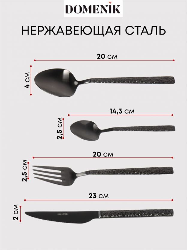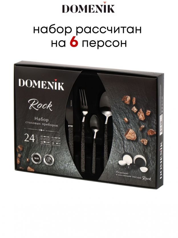 Премиальный набор столовых приборов Domenik Rock Black 24 предмета — стильный подарок и практичное решение для сервировки на 6 персон. Черная сталь, подарочная упаковка.
