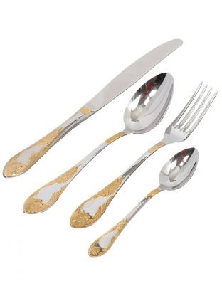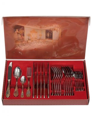Набор рассчитан на 6 персон, всего 24 предмета: столовые и чайные ложки, вилки и ножи, длина каждого прибора — 24 см, материал — нержавеющая сталь с золотым напылением.