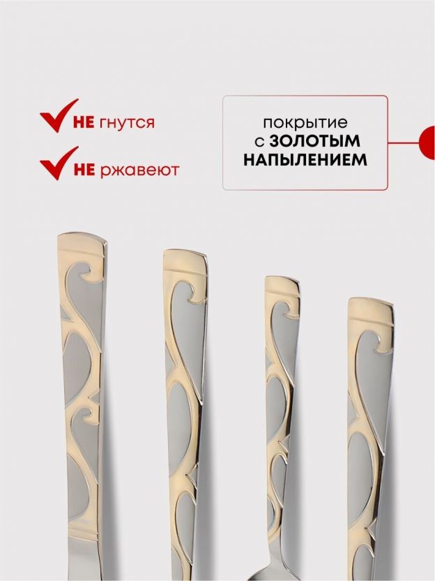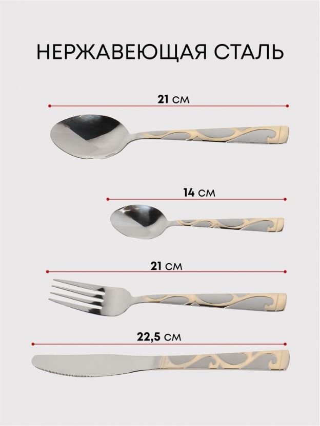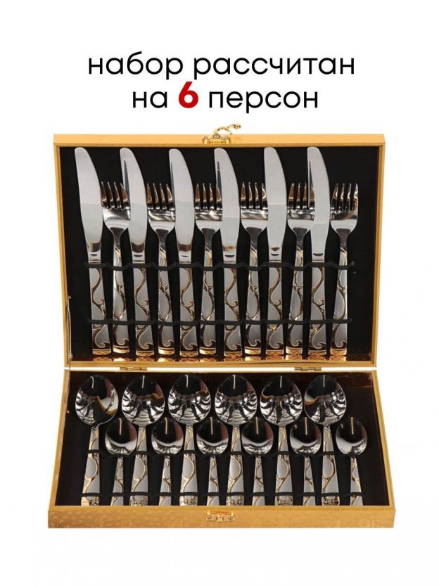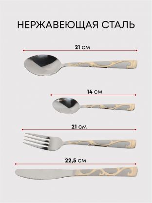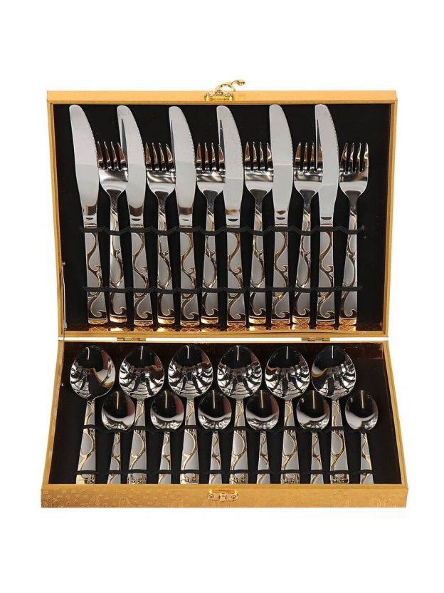 В наборе 24 предмета длиной 22,5 см, материал — нержавеющая сталь с золотыми металлическими ручками, рассчитан на 6 человек.