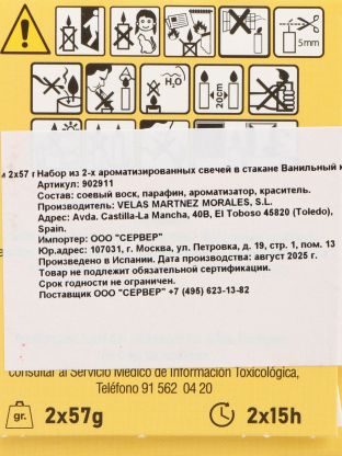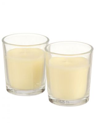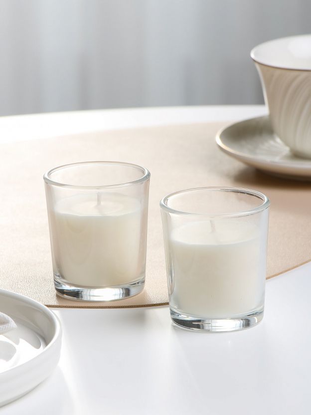 В наборе две свечи, каждая в стеклянном стакане размером 6,6x5,8 см. Свечи изготовлены из безопасного воска, не выделяющего вредных веществ при сгорании.