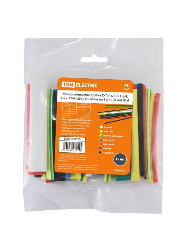 Набор трубок 4/2, 6/3, 8/4, 10/5, 12/6 мм, 35 шт, набор, 7 цветов по 5 шт, 100 мм, TDM Electric, SQ0518-0515