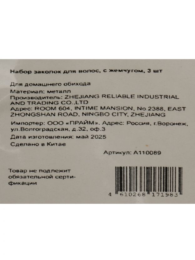 В комплекте 3 заколки, длина каждой — 6 см, основа металлическая, декор — искусственный жемчуг. Подходят для разной толщины волос.