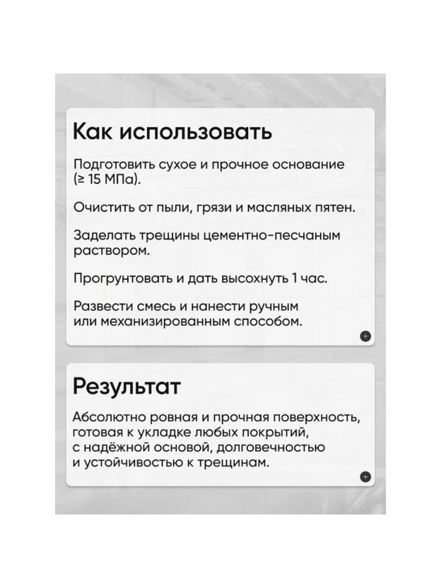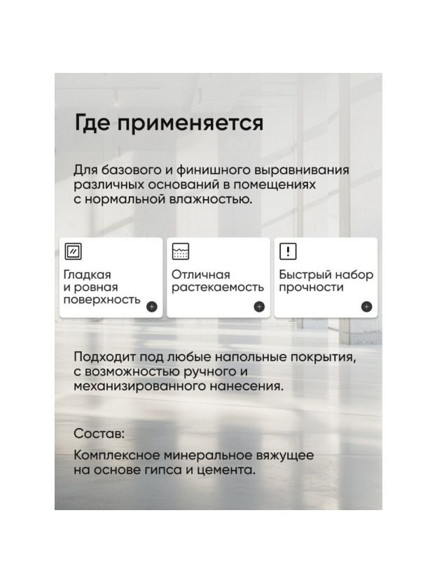 Для базового и финишного выравнивания оснований (бетонных, цементно-песчаных, гипсовых, ангидридных) под последующую укладку напольных покрытий (плитка, ламинат, паркет, линолеум, ковролин и т.д.).