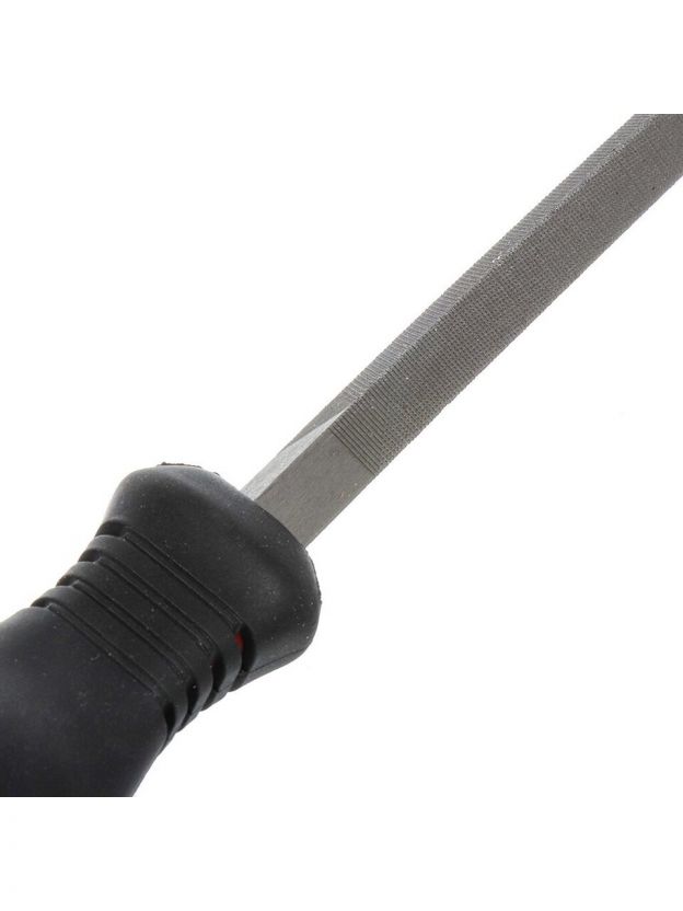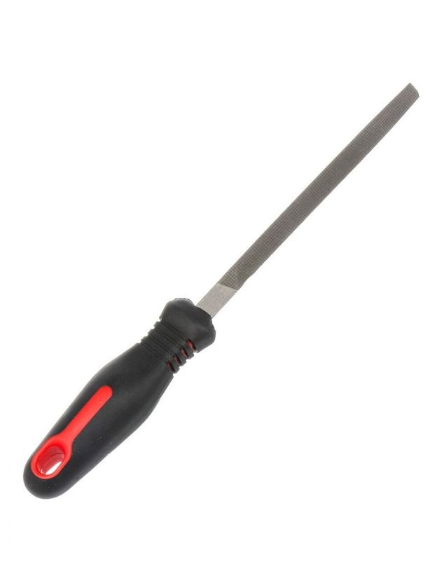 Трехгранный напильник используется при слесарных работах и мелком ремонте для опиливания и подгонки металлических деталей, зачистке клемм, обработке небольших отверстий или мелких пазов. Он имеет треугольное сечение, что обеспечивает удобство работы в труднодоступных местах. Пластиковая рукоятка обеспечивает комфорт при удержании инструмента и предотвращает скольжение в руке. Трехгранный напильник является необходимым инструментом в наборе домашнего мастера или профессионального слесаря.