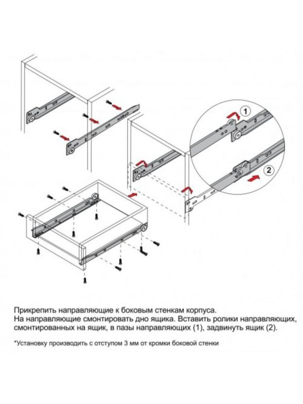 - Установка роликовых направляющих осуществляется при помощи качественных саморезов, которые обеспечивают надежную фиксацию выдвижного элемента.
