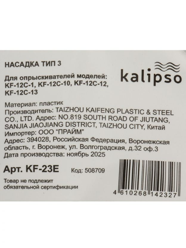 Для моделей объёмом 12 и 16 литров подходит насадка-распылитель Тип 3 (артикул KF-23E). Она совместима с большинством опрыскивателей Kalipso, легко устанавливается и рассчитана на длительное использование.