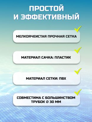 Эта насадка обеспечивает быстрое и легкое удаление листьев, насекомых и другого мусора, что позволяет наслаждаться кристально чистой водой в бассейне без лишних хлопот. Сачок имеет стандарт совместимости сачка с ручкой и другими аксессуарами диаметром 30 мм, что делает его еще более удобным в использовании.
