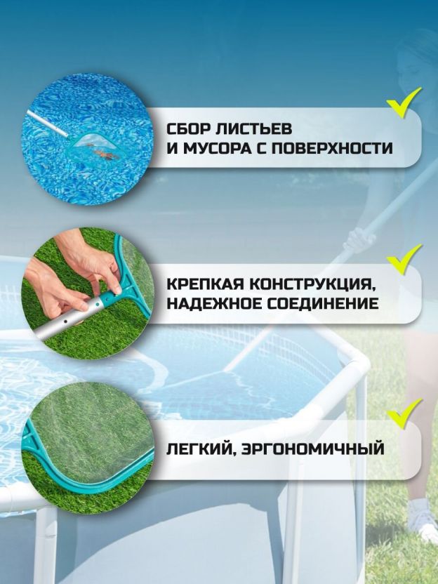 Сачок представлен в голубом цвете, который гармонично впишется в любой дизайн бассейна, добавляя эстетическую привлекательность вашему пространству. Сделайте правильный выбор для ухода за вашим бассейном и убедитесь в исключительном качестве и практичности насадки-сачка от Bestway.
