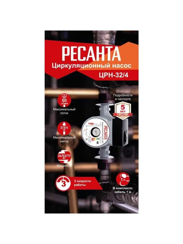 Насос циркуляционный, Ресанта, 72 Вт, максимальный напор 4 м, 3 м3/ч, ЦРН-32/4