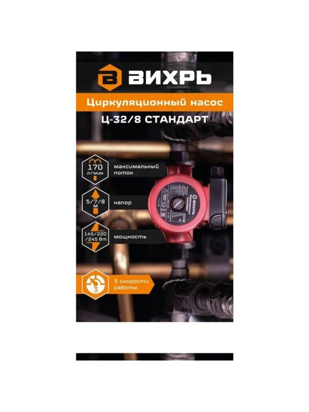 Насос циркуляционный, Вихрь, 1 1/4 '', 245 Вт, максимальный напор 8 м, 7.8 м3/ч, Стандарт Ц-32/8
