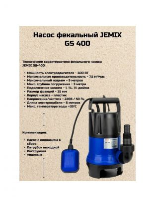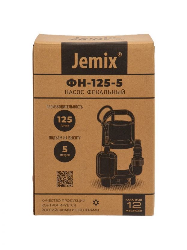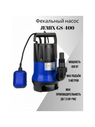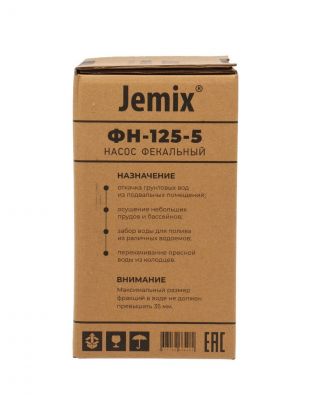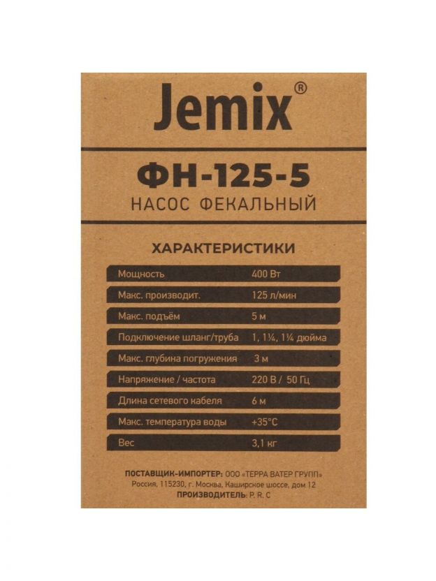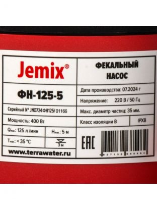 Насос дренажно-фекальный, Jemix, 400 Вт, глубина погружения 3 м, максимальный напор 5 м, 7.5 м3/ч, ФН-125-5