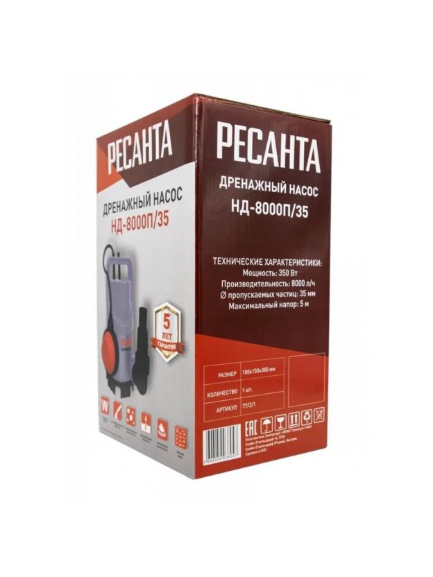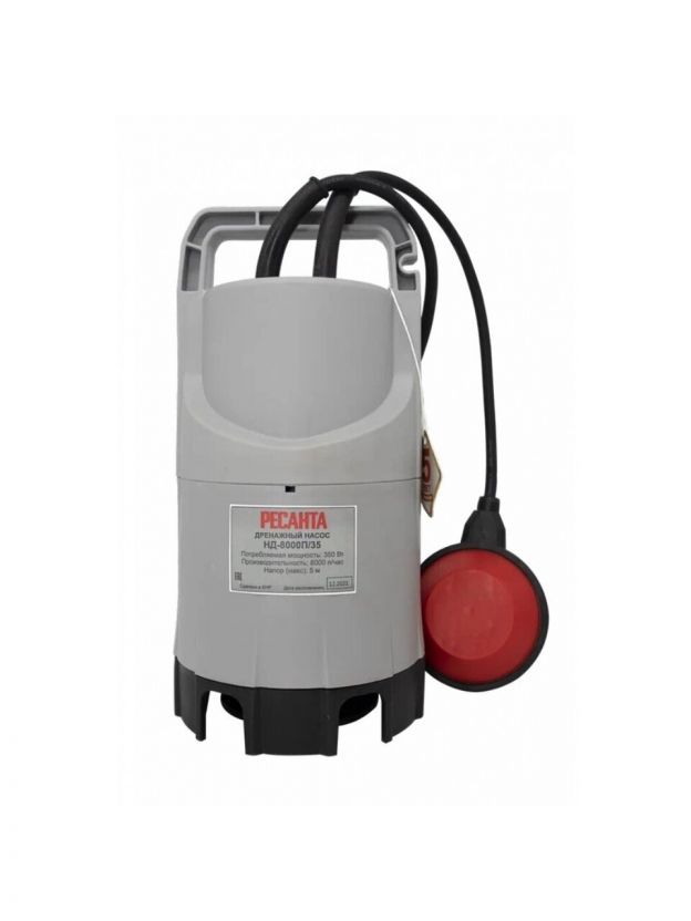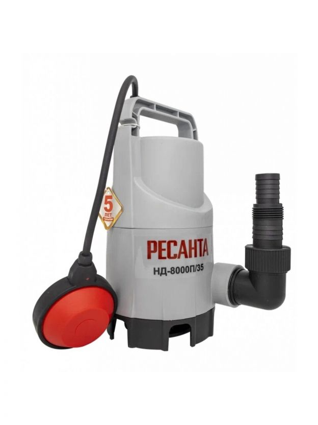Насос дренажный, Ресанта, 350 Вт, глубина погружения 5 м, максимальный напор 5 м, 8 м3/ч, НД-8000П/35