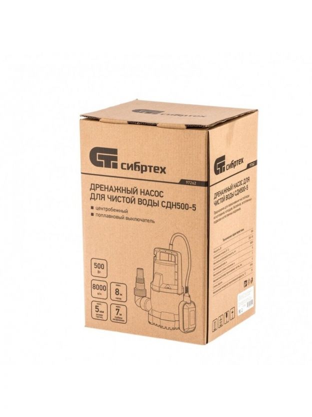 Насос дренажный, Сибртех, 500 Вт, глубина погружения 7 м, максимальный напор 8 м, 8 м3/ч, СДН500-5