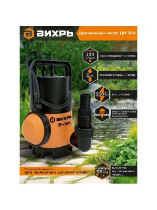 Насос дренажный, Вихрь, 350 Вт, глубина погружения 5 м, максимальный напор 5 м, 8 м3/ч, ДН-350