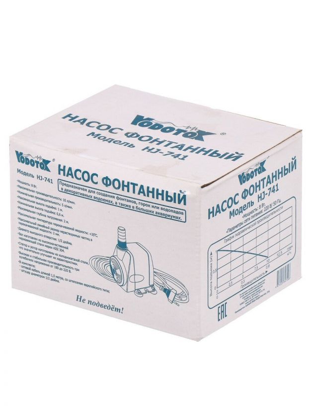 Насос фонтанный, Vodotok, 1/2 '', 1.5 м, 8 Вт, глубина погружения 2 м, максимальный напор 1 м, 0.6 м3/ч, HJ-741