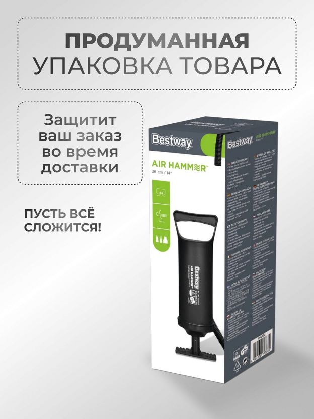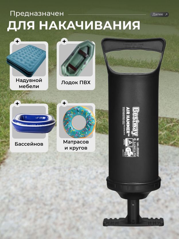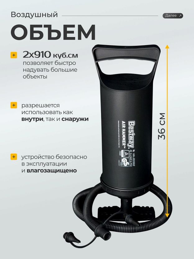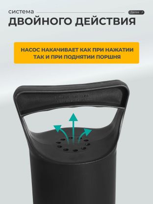- Обладает системой двойного действия: накачивает надувные изделия как при прямом, так и обратном ходе поршня.