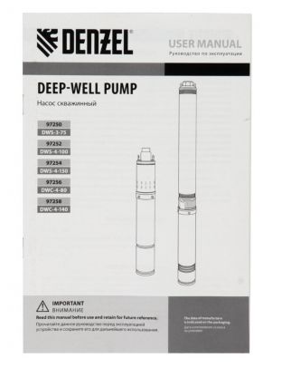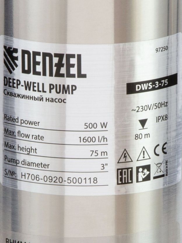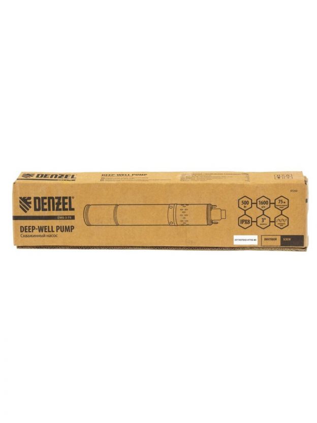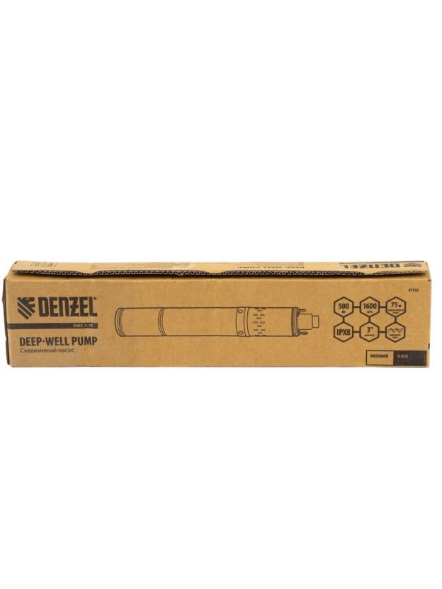 Насос скважинный, Denzel, 30 м, 500 Вт, диаметр 72 мм, глубина погружения 80 м, максимальный напор 75 м, 1.6 м3/ч, винтовой, диаметр 3", 1600 л/ч, DWS-3-75