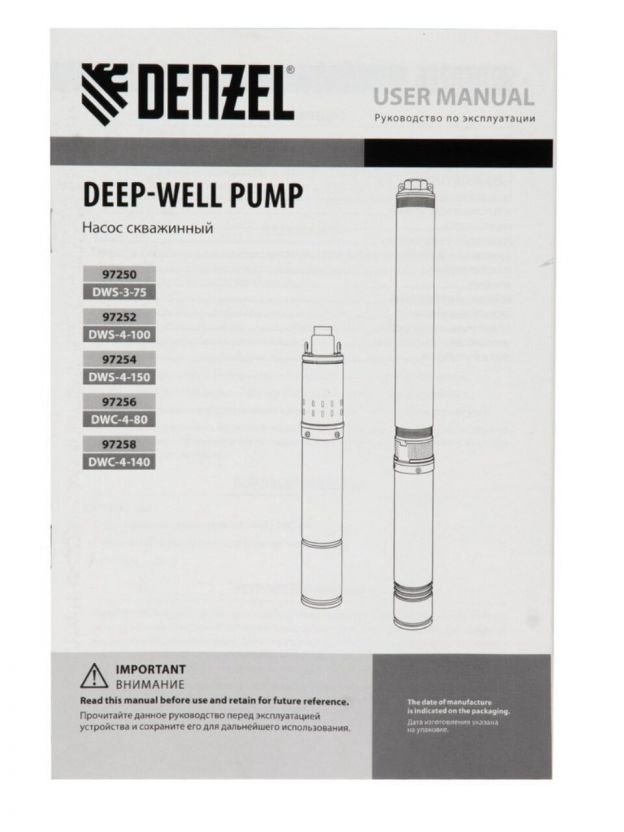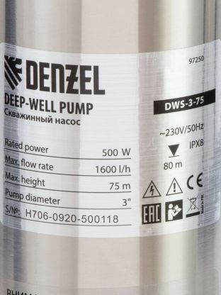 Скважинный насос Denzel DWS-3-75 предназначен для подъема чистой воды из глубоких скважин и колодцев до 80 м. Напора до 75 м достаточно для организации систем водоснабжения и полива на даче, на садовом участке или в загородном доме. Способен перекачивать воду со скоростью до 1600 л/ч.