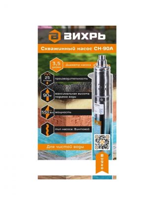 Насос скважинный, Вихрь, 1 '', верхний забор, 20 м, 550 Вт, диаметр 90 мм, глубина погружения 35 м, максимальный напор 90 м, 1.5 м3/ч, СН-90А
