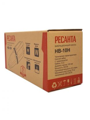 Насос вибрационный, Ресанта, нижний забор, 10 м, 300 Вт, глубина погружения 3 м, максимальный напор 75 м, 1.32 м3/ч, НВ-10Н