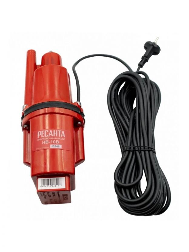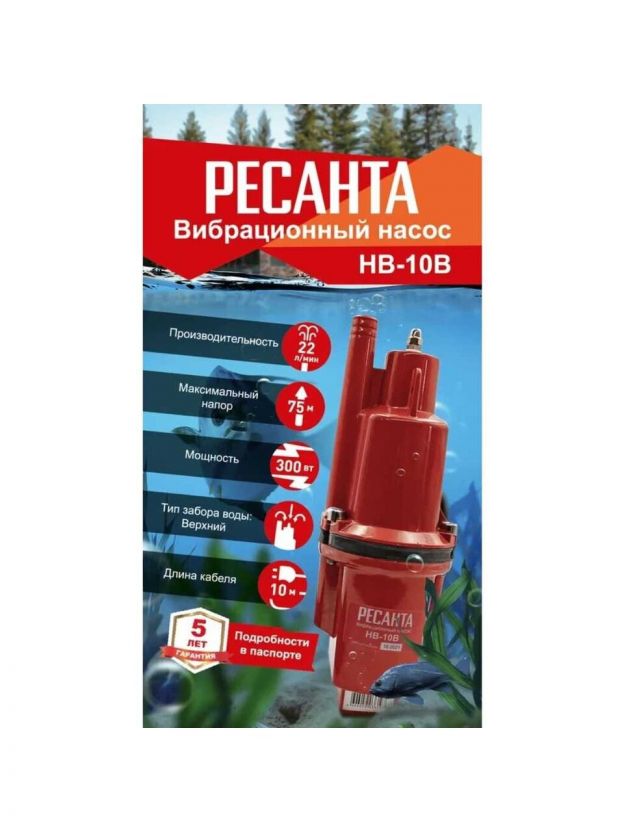 Насос вибрационный, Ресанта, верхний забор, 10 м, 300 Вт, глубина погружения 3 м, максимальный напор 75 м, 1.32 м3/ч, НВ-10В