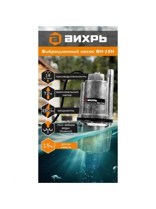 Насос вибрационный, Вихрь, нижний забор, 15 м, 280 Вт, глубина погружения 3 м, максимальный напор 72 м, 1.08 м3/ч, ВН-15Н