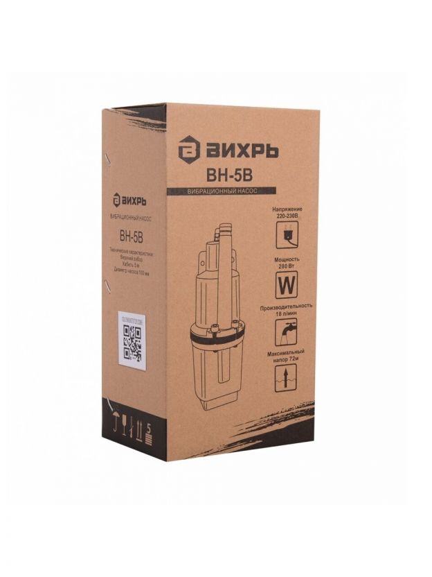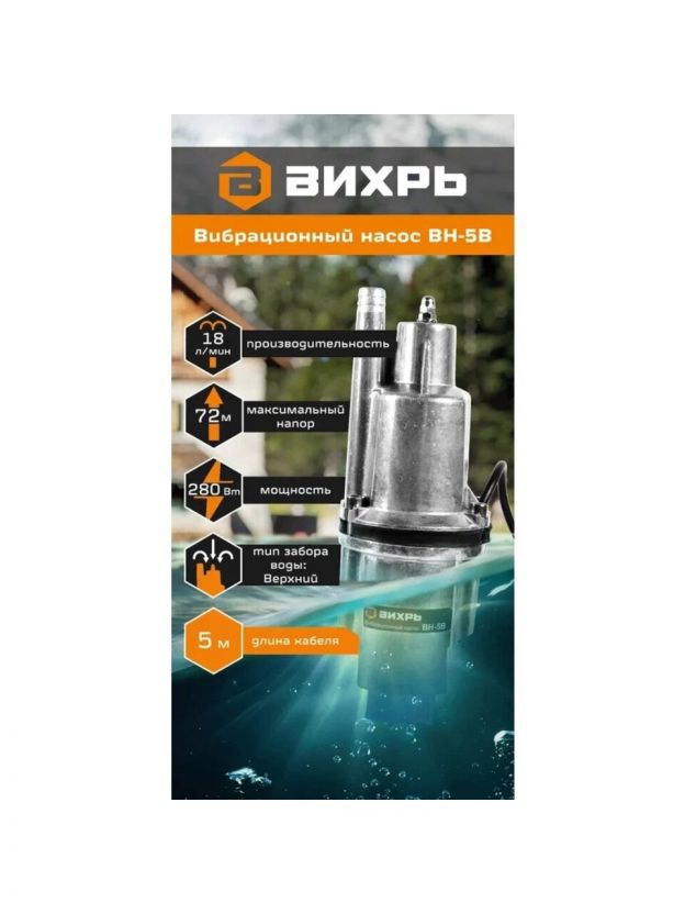 Насос вибрационный, Вихрь, верхний забор, 5 м, 280 Вт, глубина погружения 3 м, максимальный напор 72 м, 1.08 м3/ч, ВН-5В