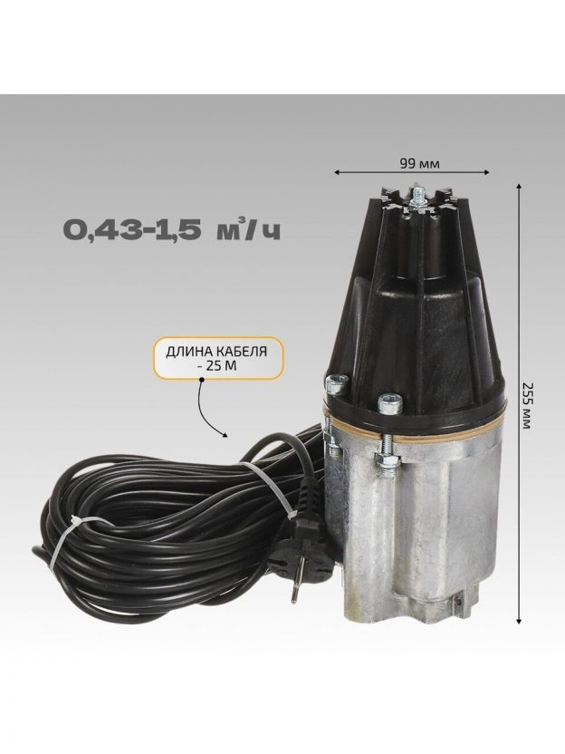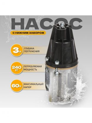 Насос вибрационный, нижний забор, 25 м, 240 Вт, глубина погружения 3 м, максимальный напор 60 м, 1.5 м3/ч, термозащита, Малыш