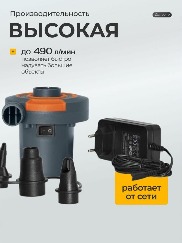 • Высокая производительность. Насос способен накачивать до 490 литров воздуха в минуту, что позволяет быстро надувать большие объекты. Это особенно полезно, если у вас есть большой надувной матрас или кровать, которую нужно надуть перед сном.