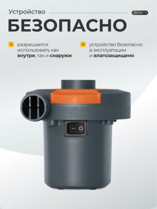 • Работает от сети переменного тока 220-240 В, что позволяет использовать его в любом месте, где есть доступ к розетке. Благодаря этому вы можете легко и быстро надуть различные предметы, где бы вы ни находились.