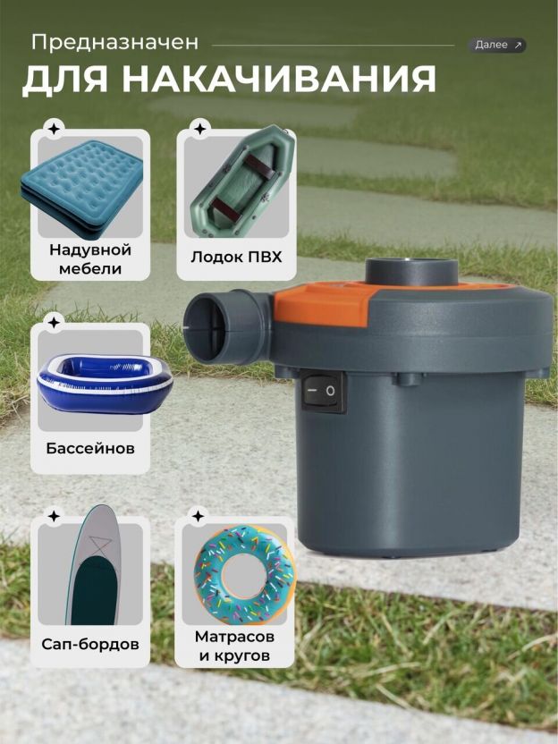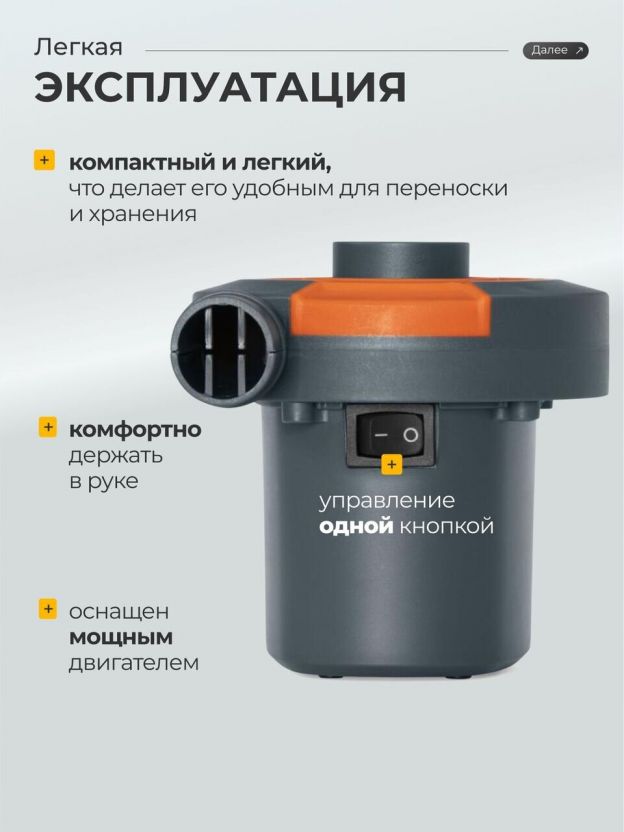 • Оснащен мощным двигателем, который обеспечивает быстрое и эффективное накачивание, сокращая время и усилия, которые вы тратите на этот процесс.