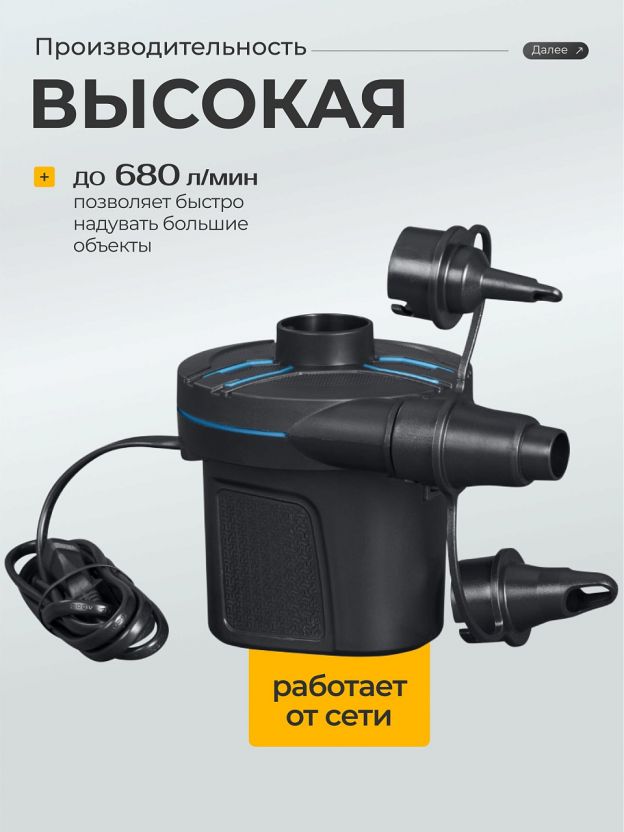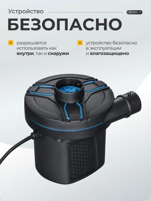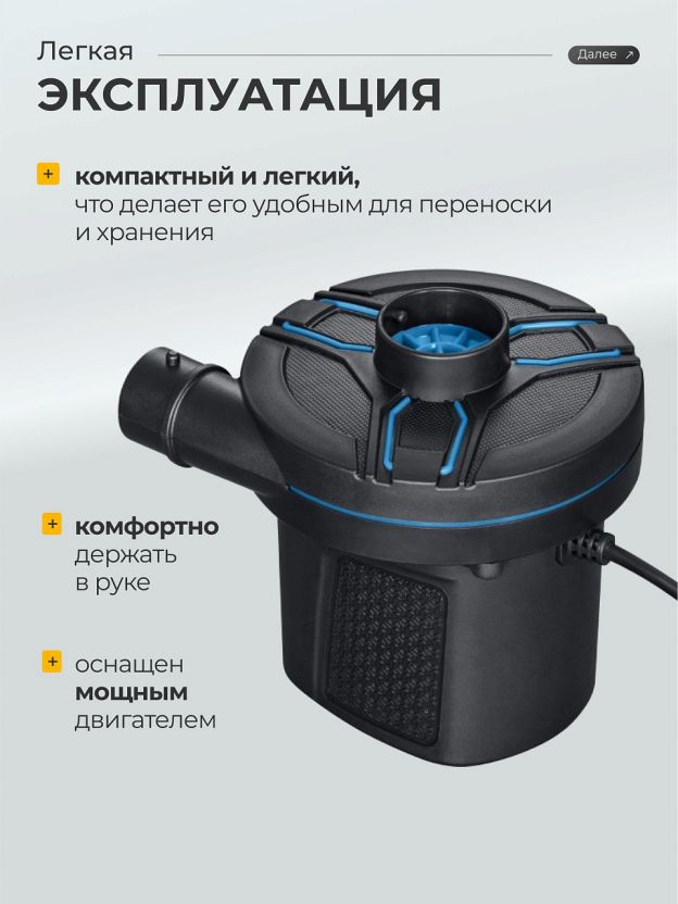 - Оснащен мощным двигателем, который обеспечивает быстрое и эффективное накачивание, сокращая время и усилия, которые Вы тратите на этот процесс.