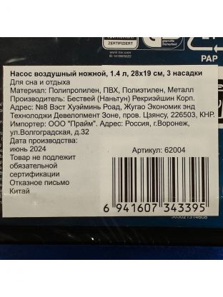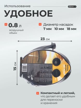- Оснащен тремя насадками разного размера, что позволяет использовать его для накачивания различных изделий - от надувных матрасов и кроватей до надувных лодок и плавательных кругов.