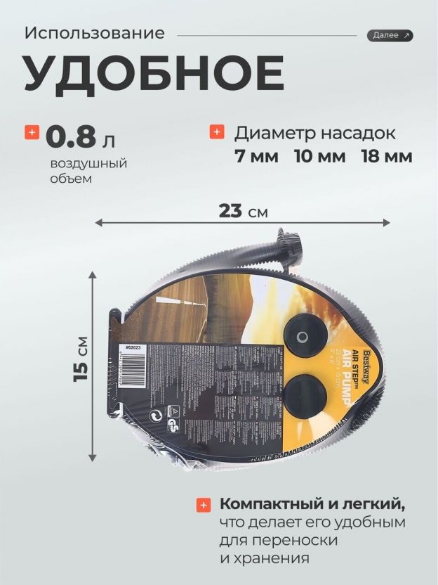 Насос воздушный ножной, 0.8 л, 23х15 см, 3 насадки, Bestway, 62023