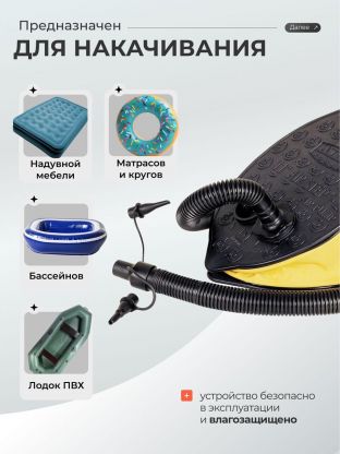 Насос ножной - это удобный и практичный инструмент, который станет незаменимым помощником во многих ситуациях. С помощью него можно легко накачать небольшие и среднего размера надувные изделия, такие как: игрушки, мячи, кровати, матрасы, лодки, бассейны с надувным верхом и т.п.